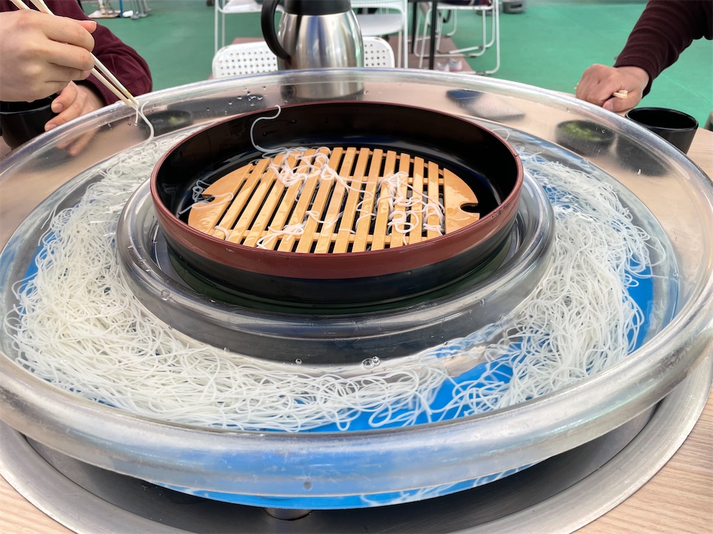 テーブルの真ん中にあるプールのようなところにそうめんを流せば、簡易的な流しそうめんが味わえるということらしいです。